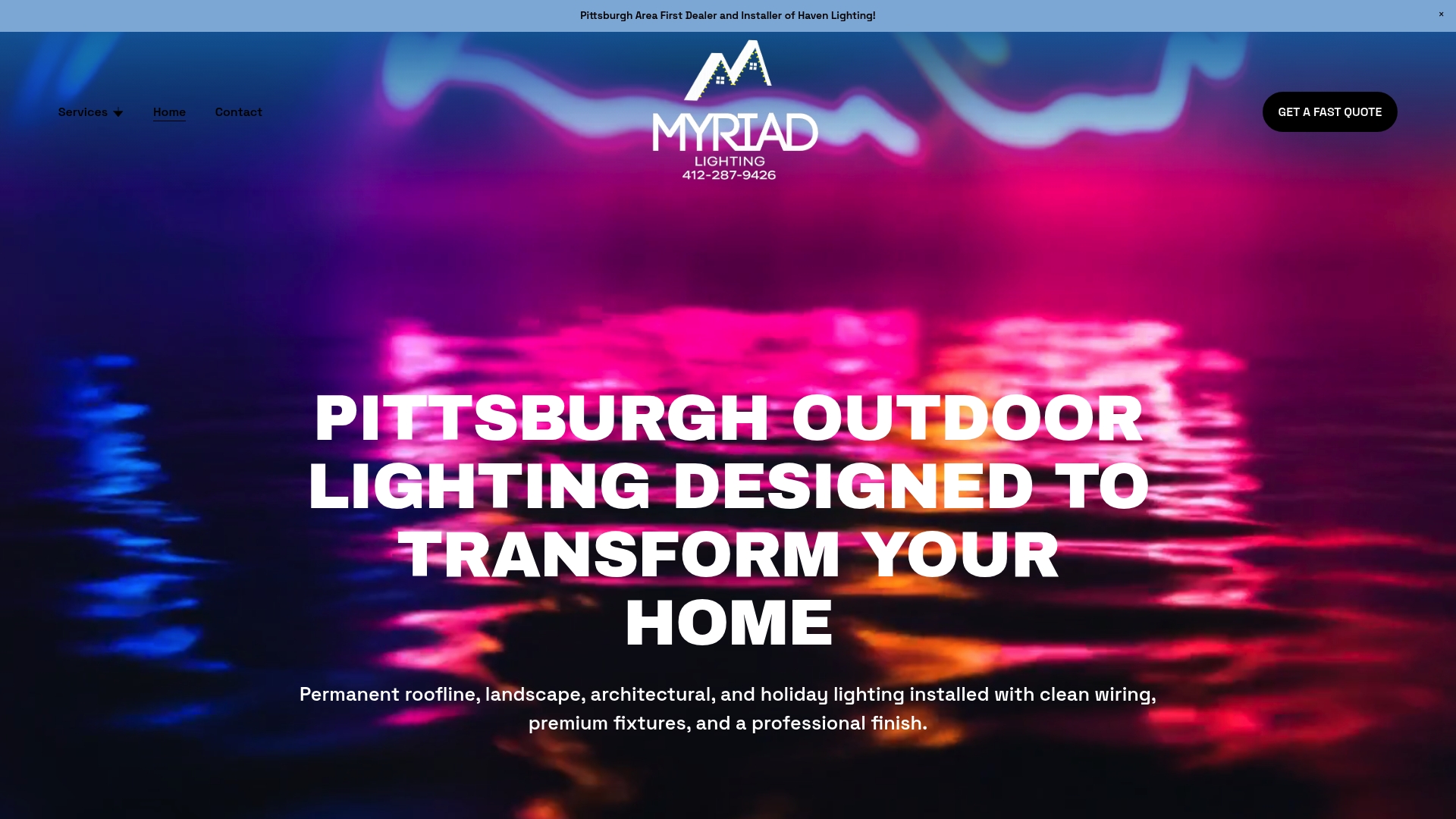 Myriad Lighting specializes in permanent roofline lighting, landscape lighting, and architectural accent lighting with clean wiring and premium fixtures. They also provide holiday, wedding, and event lighting and are the first Haven Lighting dealer and installer in Pittsburgh.