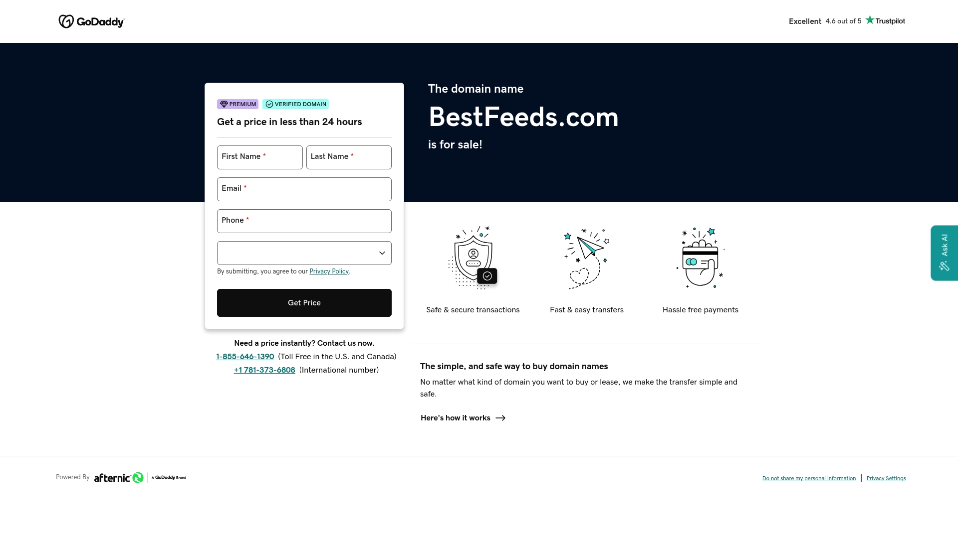 BestFeeds.com is a domain marketplace focused on secure, straightforward domain purchases and transfers for premium and verified names. It works well for anyone who wants quick pricing and a no fuss buying process backed by a known marketplace partnership.