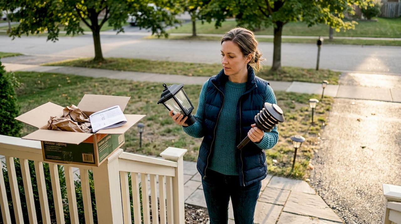 Pro Tip: Stand at your front door and look toward the street. If you see the bulb directly, the fixture is angled too high. Adjust until you see only the glow, not the source.