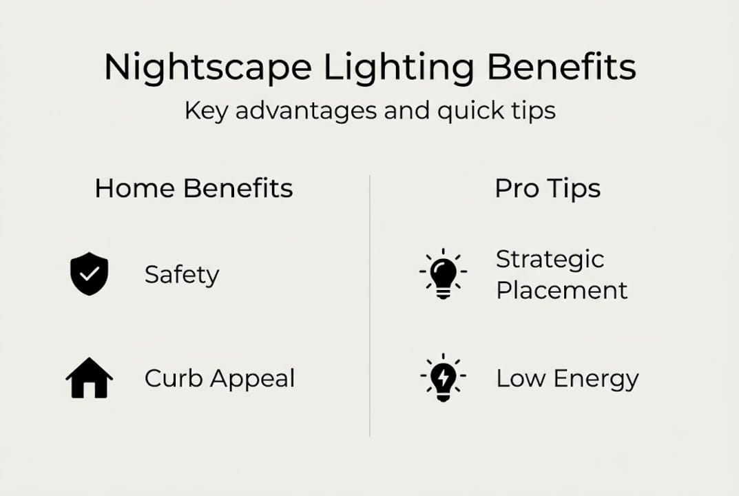 Nightscape lighting enhances safety, aesthetics, and usability after dark, and those three pillars each carry real weight when you break them down.